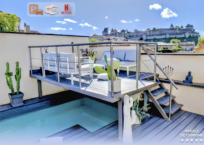 Su en territorio privado ubicación ofrece un rápido acceso al Carcason, que está a 750 metros, a un paso de la estación de autobuses Pont Vieux. Entre los lugares de culto de los alrededores se encuentra la basílica Saint-Nazaire, situada a 800 metros. La La Maison Blanche 5*, Piscine & Vue Cite Medievale está a unos 500 metros de Chapeau Rouge.